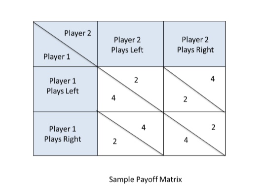 Let's take an example. Suppose that Player 1 selects Left. This choice might then provide Player 2 with two points if he also selects Left and 4 points if he picks Right. If Player 1, instead of Left were to choose Right, then the consequences for Player 2's choices might be reversed: a response to the Left would get 4 points and a response to the Right would get two points.